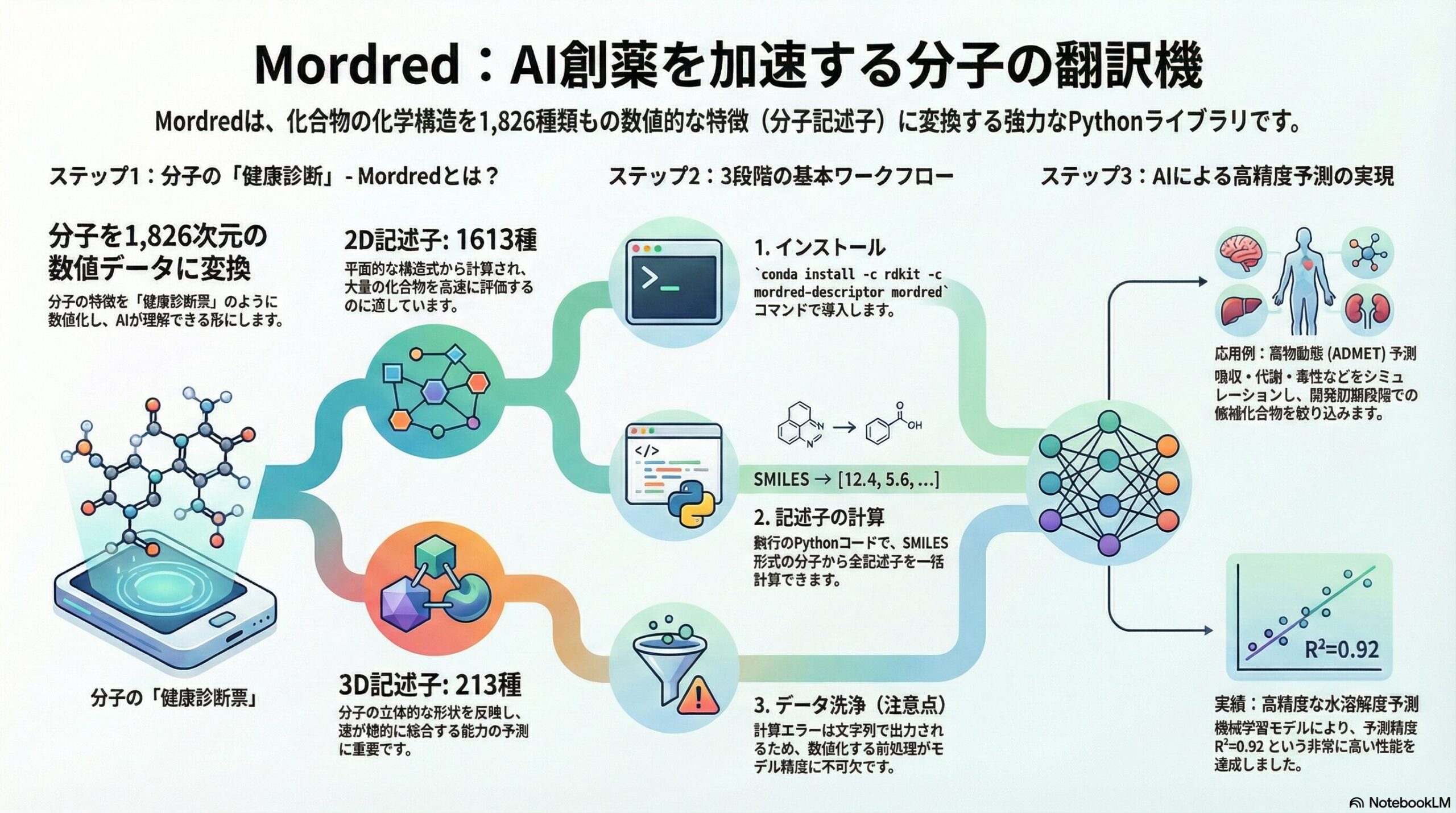 私たちは、医師や薬剤師が処方箋を読み解くように、コンピューターに化合物の構造を理解させなければなりません。そのための「翻訳機」の役割を果たすのが、今回ご紹介する「Mordred(モルドレッド)」というツールです。本記事では、Mordredの基礎から実践的な活用法までを、医療関係者の皆様に向けて分かりやすく解説します。
