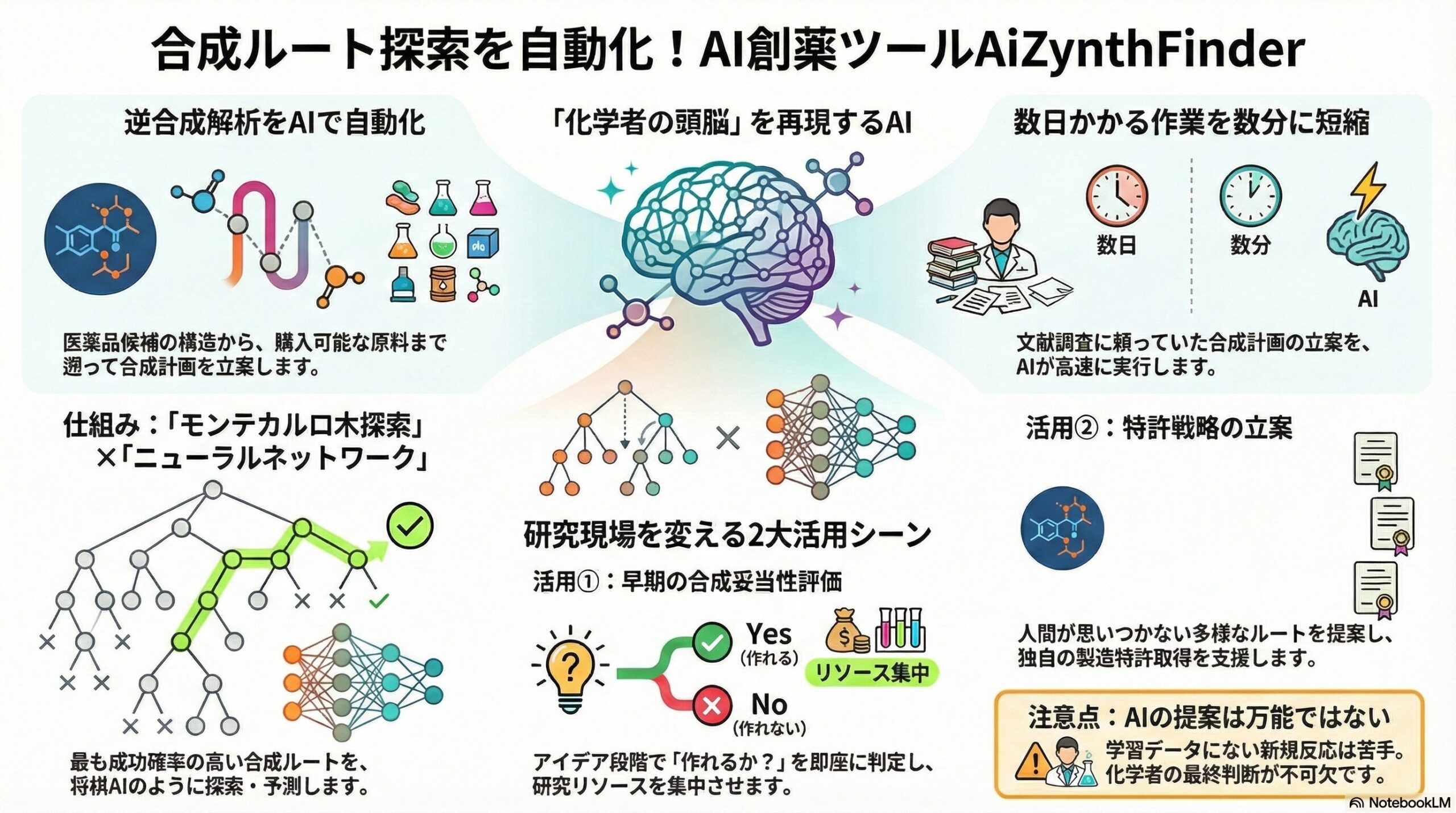 熟練の化学者の頭脳をAIで再現。合成ルート探索を数日かかった作業から数分に短縮する、AiZynthFinderの仕組みと主要な活用シーンです。