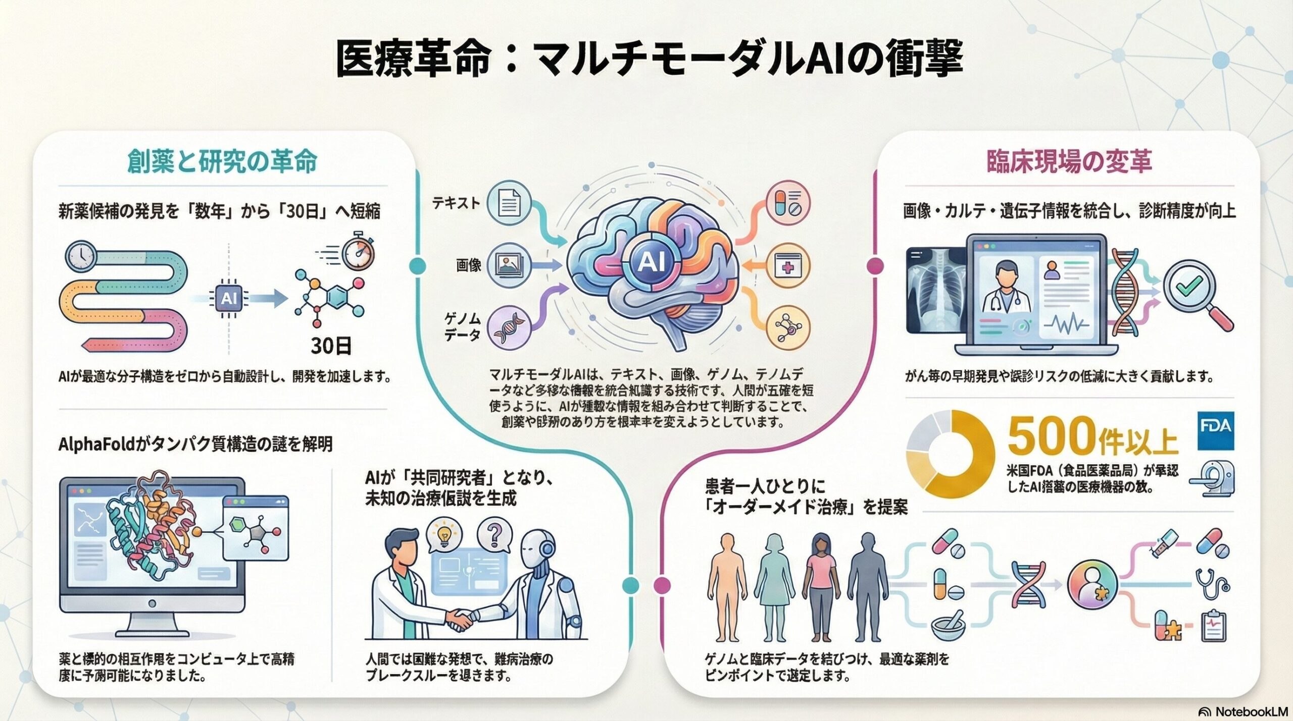 複数のデータを統合する「マルチモーダルAI」が、新薬開発から臨床現場まで、現代医療のあり方を根底から変えようとしています。