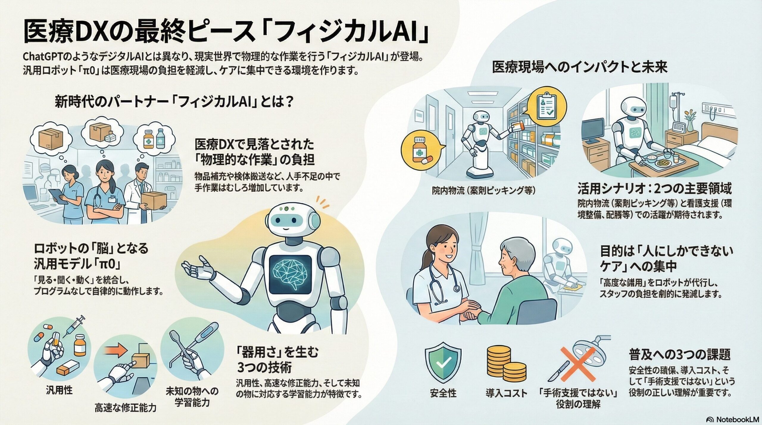 図:フィジカルAI「π0(パイゼロ)」がもたらす医療現場の変革イメージと、普及に向けた課題