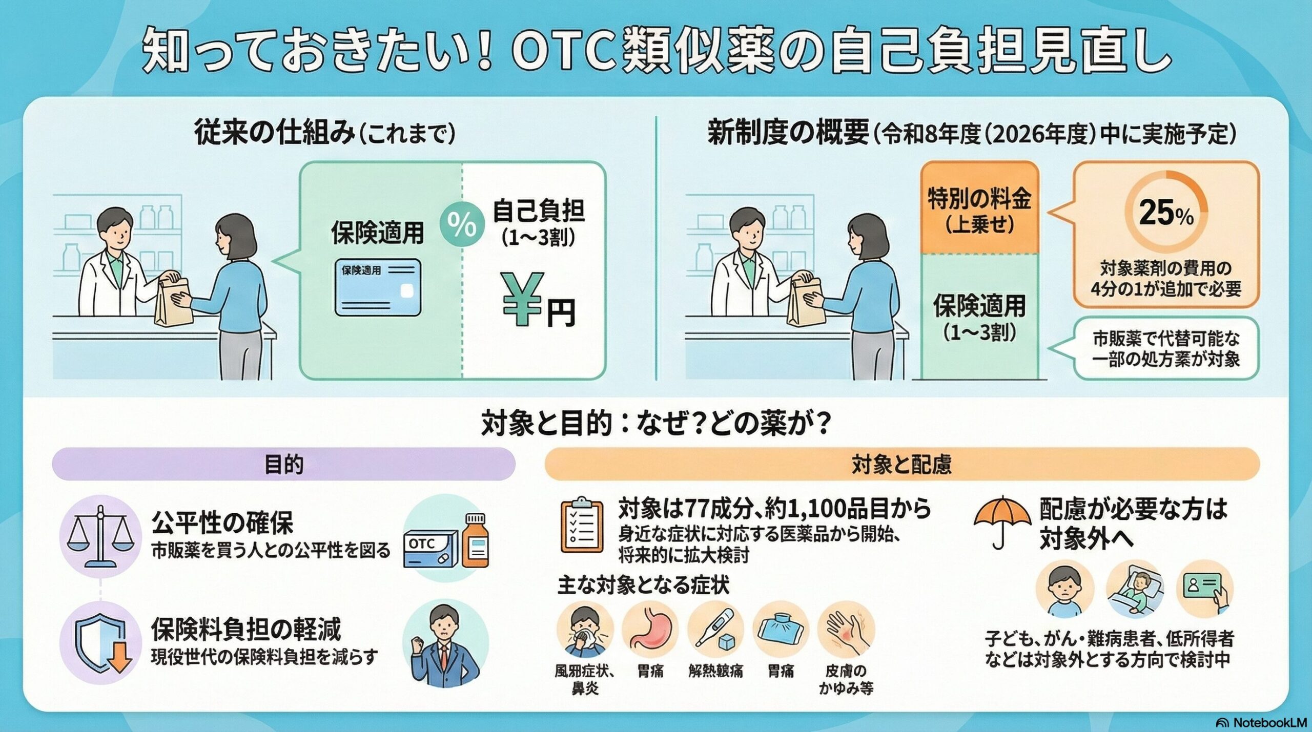 OTC類似薬の新制度における自己負担の変化と制度の目的(令和8年度中の実施予定)