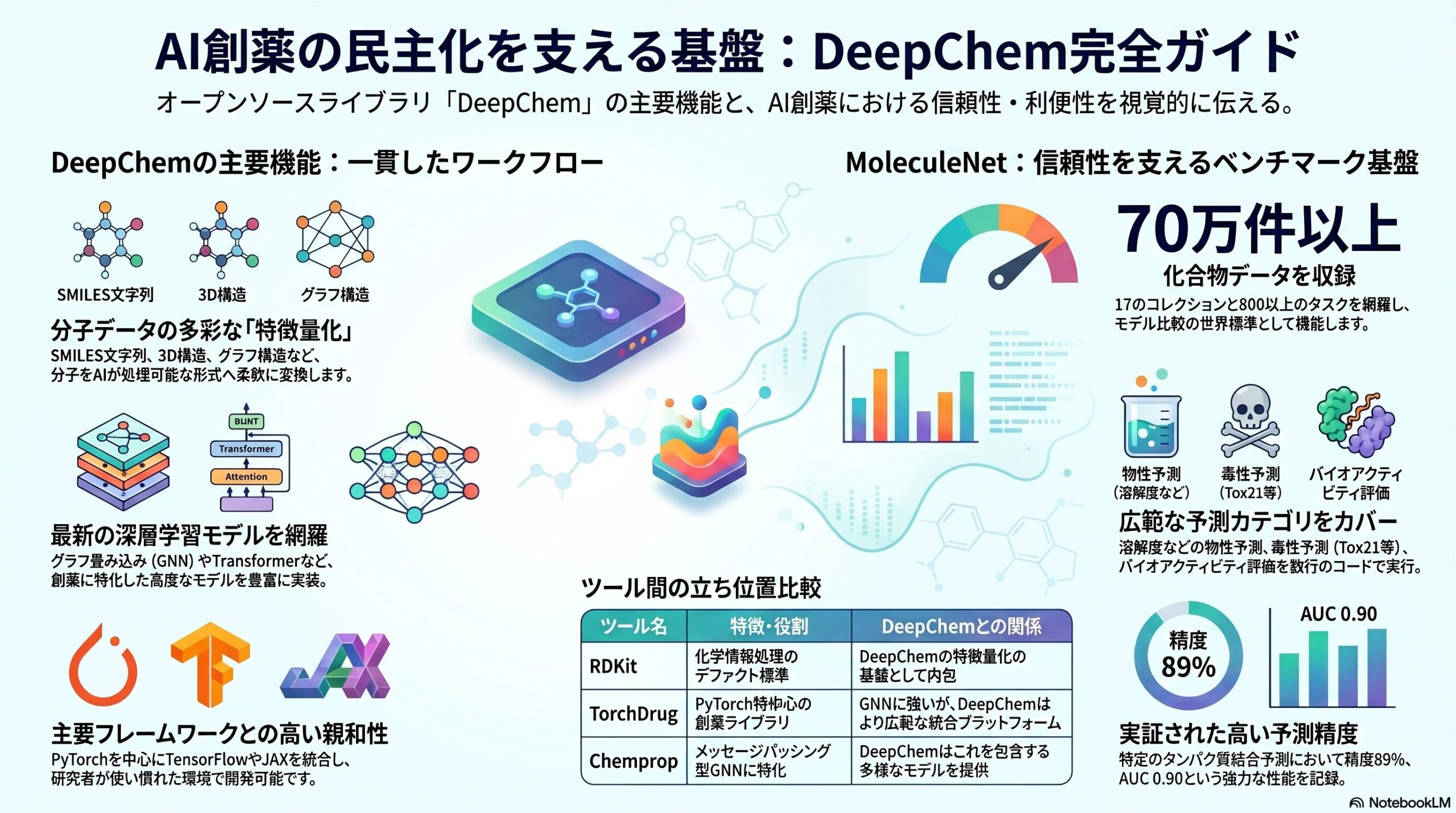 AI創薬の民主化を支える「DeepChem」の包括的なワークフローと信頼性を示すインフォグラフィック