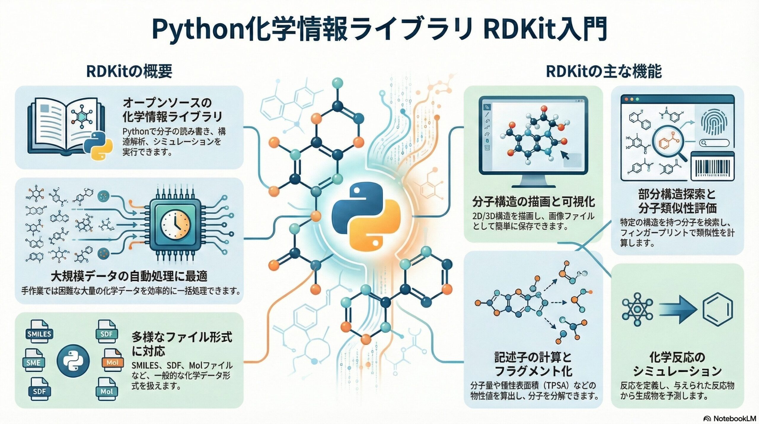 RDKitは、化学構造をコンピューターで扱うための「化学情報学(ケモインフォマティクス)」用ツールキットです。オープンソースとして無料で提供されており、世界中の製薬企業や大学の研究者が利用しています。いわば、デジタルの世界で化合物を計り、形作り、評価するための「万能な物差し」のような存在です。