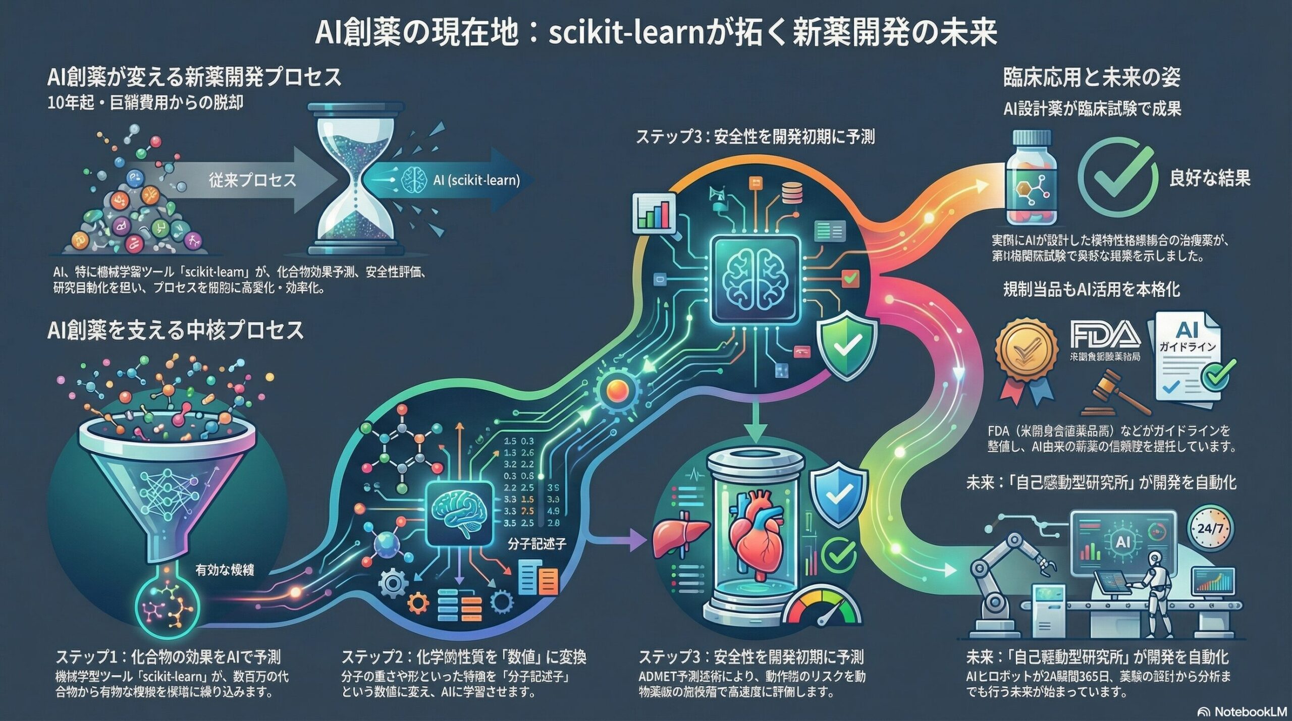 2025年におけるAI創薬の現在地。機械学習ライブラリ「scikit-learn」を核とした、新薬開発プロセスの劇的な効率化と未来の姿