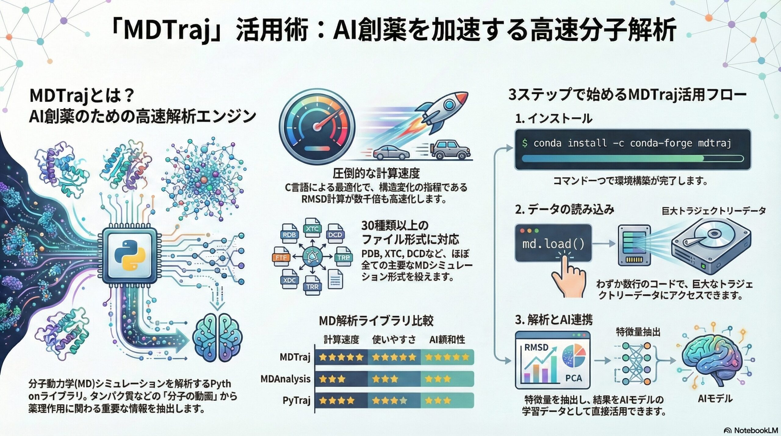 AI創薬の現場で注目されるMDTraj。その圧倒的な計算速度とAI連携までのシンプルな解析フロー