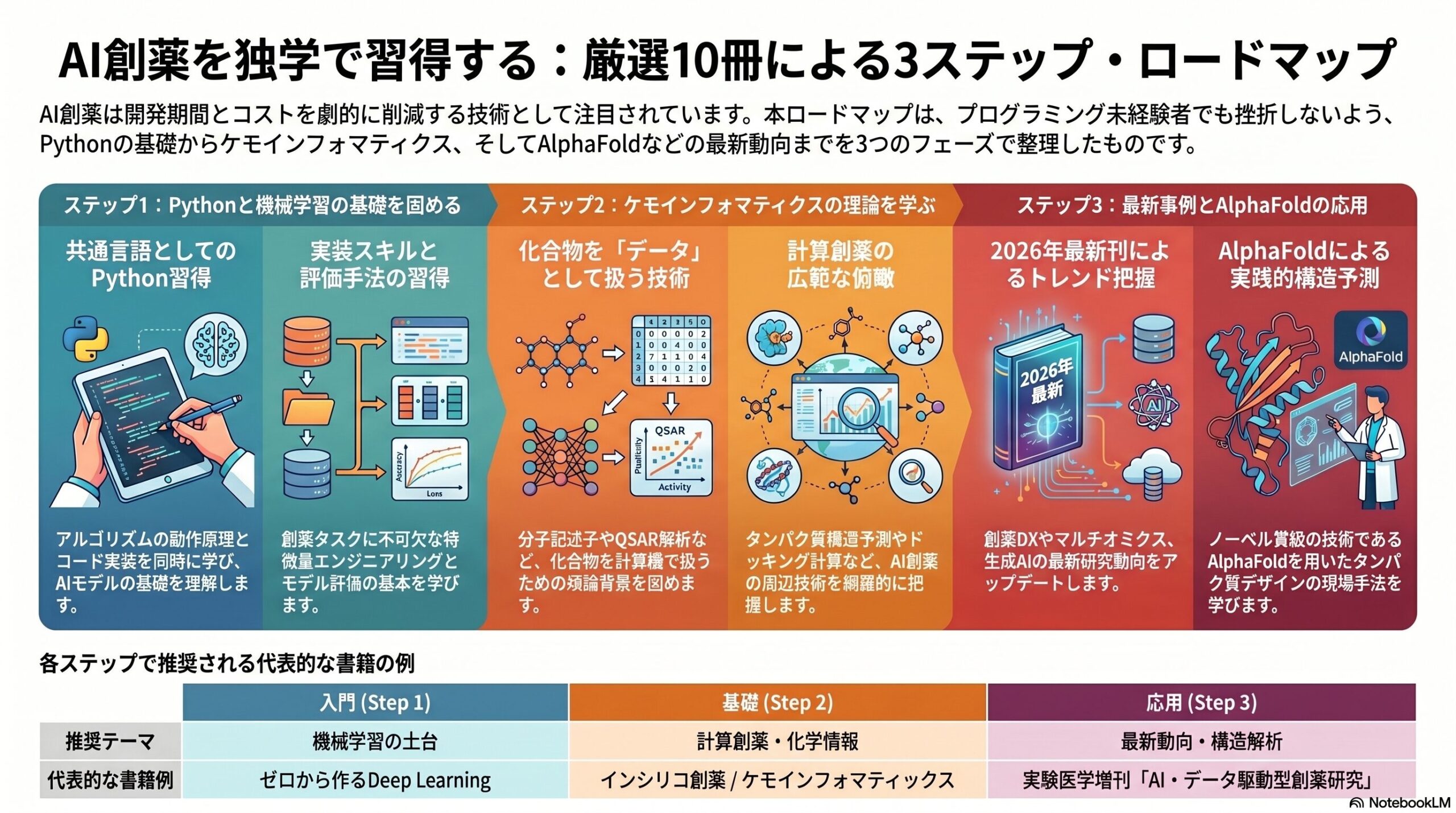 AI創薬は、機械学習・化学・生物学・薬学が交差する学際的な分野です。だからこそ、一冊の万能書ではなく、複数の書籍を段階的に読み進めることが、最も確実な習得ルートになります。