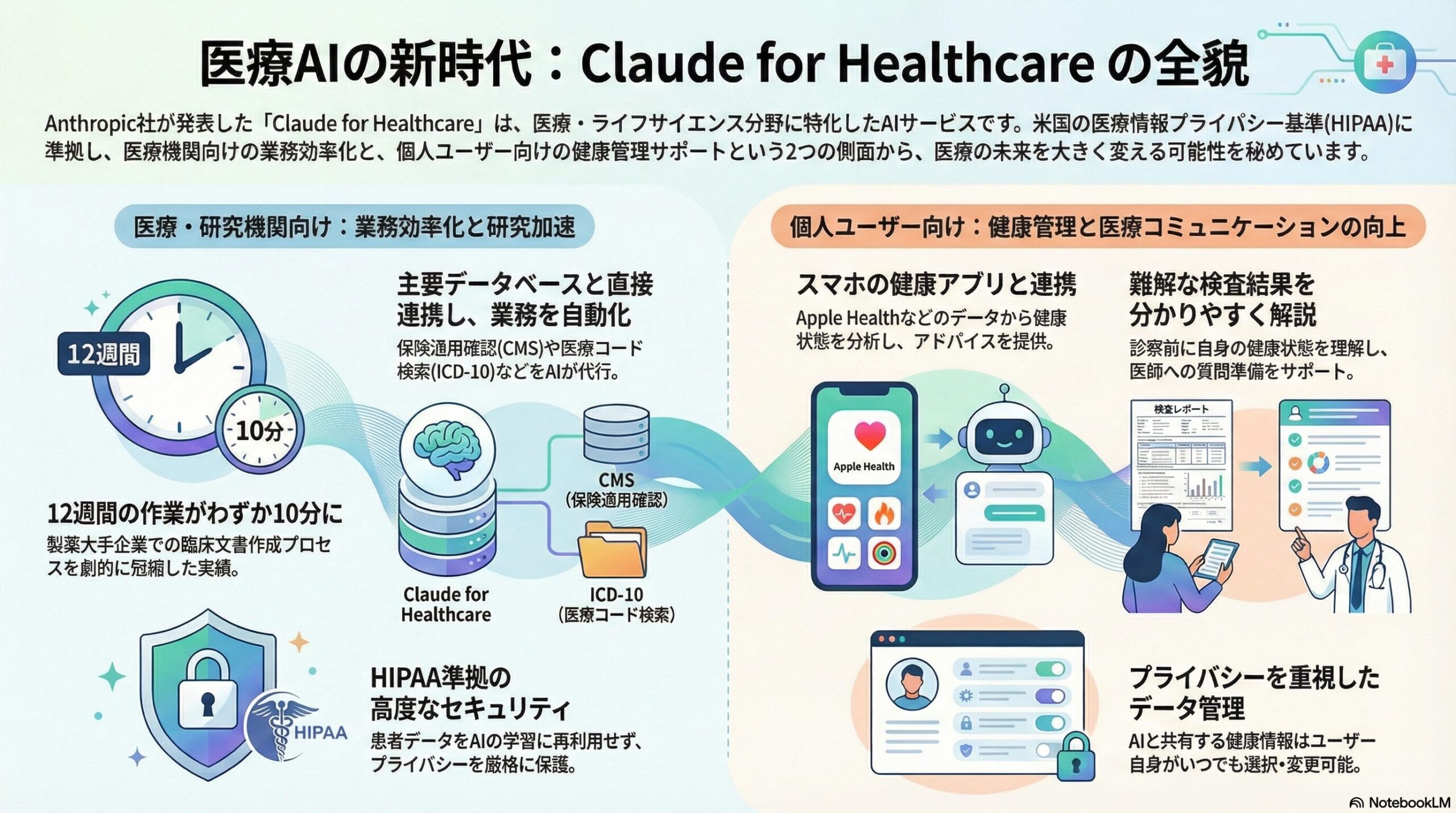 健康を維持し、より良く生きるための包括的な活動」のこと。 最新のAI活用(Claude for Healthcare等)の文脈では、主に以下の2つの領域を指します。 個人の健康管理: スマートフォン等を利用した、日常の健康状態の把握や疾病予防。 専門的な医療・研究: 病院での診療、保険事務の効率化、新薬の開発(ライフサイエンス)などの専門業務。 つまり、「自分で行う体調管理」から「プロによる医療サービス」までを、テクノロジーで支える仕組み全体をヘルスケアと呼ぶ。