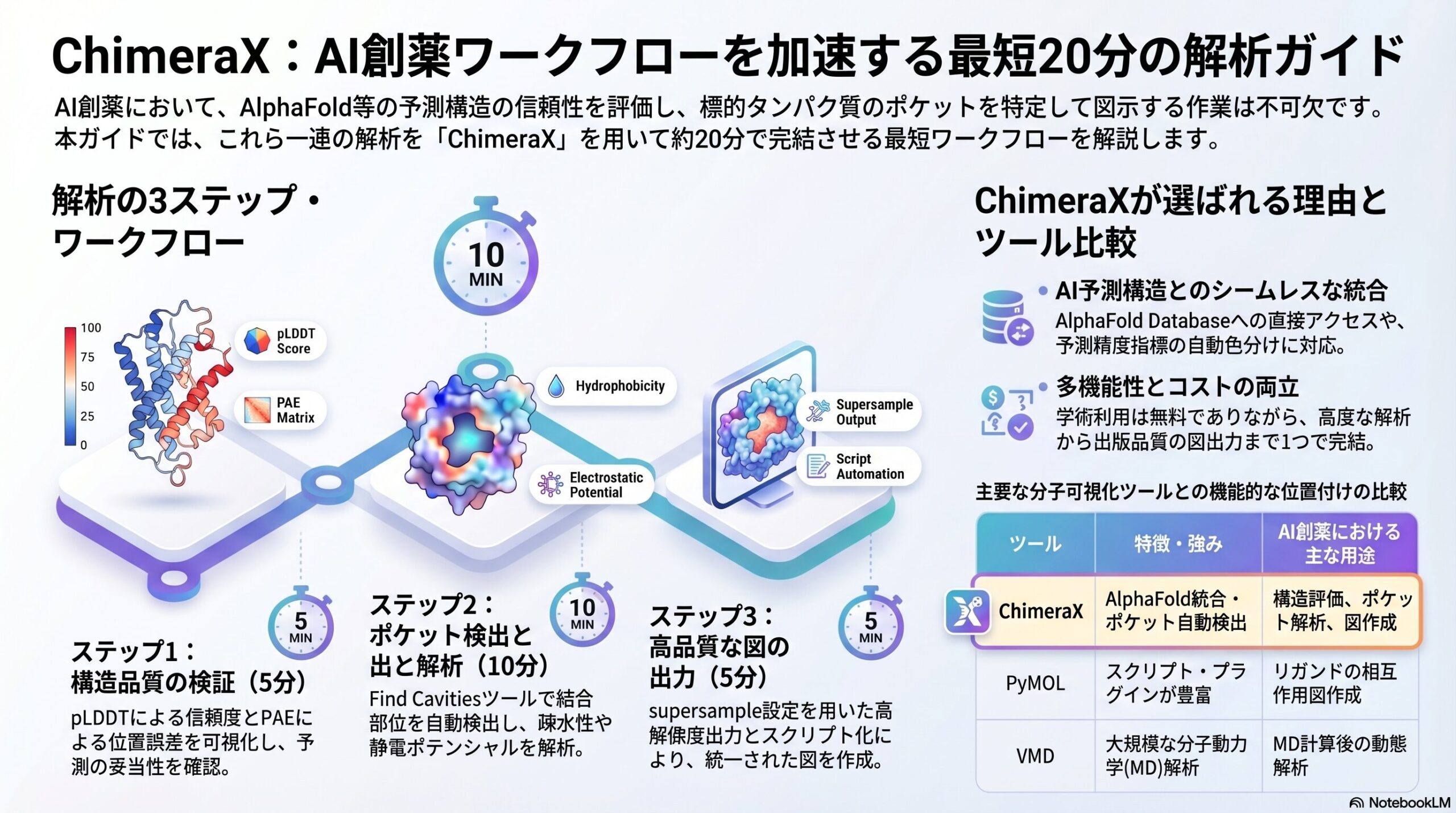 ChimeraXが実現するAI創薬の3ステップ。構造評価・ポケット解析・図出力を1つのソフトで完結し、約20分で論文品質のアウトプットを得られます。
